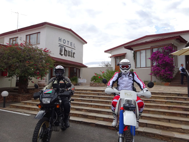Schöne Motorräder. Nur der Rückspiegel ist auf der verkehrten Seite: Namibia = Linksverkehr !